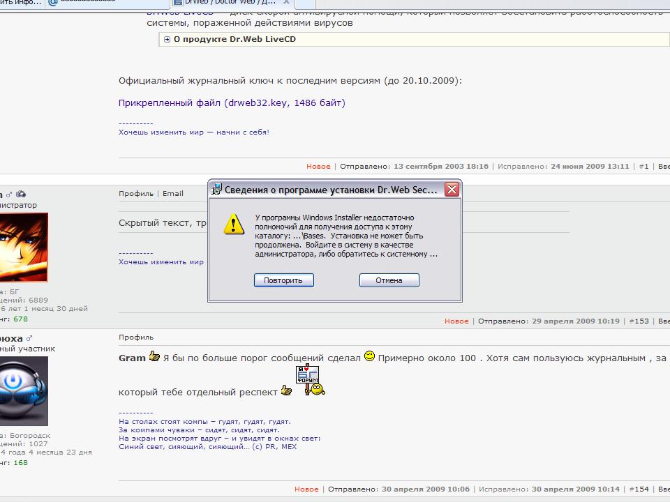 Цитата: У Вас проблемы с доступом к дирректории C:\Documents and Settings\All Users\Application Data\Doctor Web\ и вложенным в них. Денис, ты там наверное уже на установленный Dr.Web накатываешь Dr.Web Security Space. Ты бы лучше сначала все версии удалил вот этой утилиткой: Drweb Antivirus Removal Tool, а затем заново поставил бы. ----------