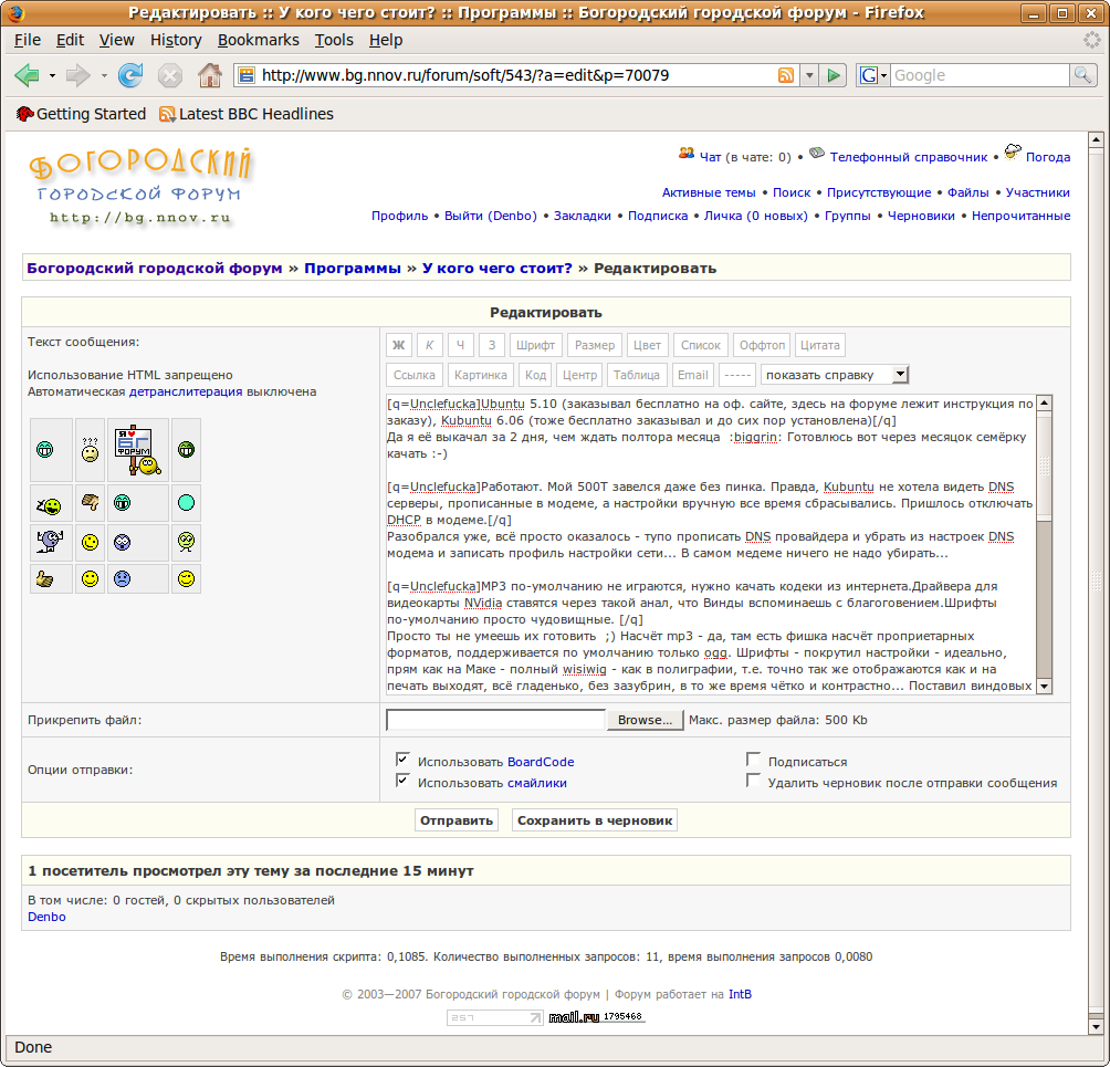 Unclefucka написал: Ubuntu 5.10 (заказывал бесплатно на оф. сайте, здесь на форуме лежит инструкция по заказу), Kubuntu 6.06 (тоже бесплатно заказывал и до сих пор установлена) Да я её выкачал за 2 дня, чем ждать полтора месяца Готовлюсь вот через месяцок семёрку качать ![]() Unclefucka написал: Работают. Мой 500Т завелся даже без пинка. Правда, Kubuntu не хотелa видеть DNS серверы, прописанные в модеме, а настройки вручную все время сбрасывались. Пришлось отключать DHCP в модеме. Разобрался уже, всё просто оказалось - тупо прописать DNS провайдера и убрать из настроек DNS модема и записать профиль настройки сети... В самом медеме ничего не надо убирать... Unclefucka написал: MP3 по-умолчанию не играются, нужно качать кодеки из интернета.Драйвера для видеокарты NVidia ставятся через такой анал, что Винды вспоминаешь с благоговением.Шрифты по-умолчанию просто чудовищные. Просто ты не умеешь их готовить Насчёт mp3 - да, там есть фишка насчёт проприетарных форматов, поддерживается по умолчанию только ogg. Шрифты - покрутил настройки - идеально, прям как на Маке - полный wisiwig - как в полиграфии, т.е. точно так же отображаются как и на печать выходят, всё гладенько, без зазубрин, в то же время чётко и контрастно... Поставил виндовых шрифтов, всё в полном ажуре, сижу не нарадуюсь, тексты читая... Кстати сравните скриншот ниже с тем что вы видите в виндах - imho - как небо и земля...Дрова - в семёрке обещают полный комплект для nVidia и ATI. А вообще все перечисленные проблемы решаются за 2 минуты - ставишь automatix2 или EasyUbuntu. выбираешь галками дрова, шрифты, кодеки и ещё туеву кучу прибамбасов - всё выкачивается и проставляется автоматом, даже не пикнув... А уж если хочется "всё из коробки" - лучше взять Linux Mint - та же ubuntu, только с полным комплектом дров и кодеков, плюс несколько своих специфичных примочек навеянных Сусей. Unclefucka написал: Моё ИМХО - Linux'у на десктопах пока что делать нечего (а лица без интернета его должны вообще обходить за километр). Потуги ощущаются, но результаты пока удручают. Возможно, 7ая Ubuntu покажет что-то стоящее. Тут могу поспорить, после 2 недель проведенных под Линухом... Всё вполне работоспособно и комфрортно (а уж если прикрутить beryl - Vista со своими "стеклопакетами" отдыхает... ) И что самое главное - всё бегает очень шустро, нет тормозов характерных для виндов (попробуйте сунуть cd и открыть одновременно окно или запустить программу, вот где тормоз!), нет визжащего Каспера и его тормозов, никакого вареза и глючных кряков и т.п...Единственный нюанс - да, система не для домохозяек да и вообще не для всех, этакий конструктор, но очень гибкий и позволяющий накрутить всё под себя... Хотя если тупо поставить ту же Ubuntu любой сектретутке как офисную систему - она даже разницы с виндами не заметит скорее всего Кстати, давно уже пытался попробовать Линух, года 3 назад ставил себе Mandrake 10, недавно пробовал Mandriva 2007 - не легла у меня к ней душа, зато Ubuntu - поставил и понял - моё Так что всё зависит от конкретного дистрибутива... ну и плюс желание не просто тупо жать кнопки, а разбираться с чем-то новым... | |