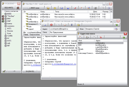| The Bee Эта маленькая "пчелка" выполняет роль аськи, мэйлера, ньюсридера и программы для создания "подшивок" избранных статей и дайджестов из текстов писем, полученных как самой программой "The Bee", так и любой другой (Outlook Express и т.д.). "The Bee" не требует инсталляции, не записывает данные в системные файлы и реестр, не сохраняет промежуточные результаты работы на локальном диске. Это позволяет запускать программу прямо с дискеты, флешки или компакт-диска на любом компьютере (дома, на работе, в гостях, в Интернет-кафе и т.д.) без создания новых учетных записей и не беспокоясь, что она оставит после себя что-то лишнее... ICQ: любое количество учетных записей; работа через прокси; никакой рекламы и банеров. E-Mail и News: поддержка SSL; работа с Base64 (MIME), Quotet-Printable, UTF-8, UUCode, KOI8-R, HTML; поддерживаются аттачи; любое количество учетных записей; встроена адресная книга. Даже если Ваш почтовый сервер не поддерживает протокол IMAP, "The Bee" поможет просмотреть заголовки писем и удалить ненужные без загрузки на компьютер. Особое внимание уделено сохранению почты. "The Bee" может добавлять к существующим файлам текст целой группы писем, одного письма или только выделенного фрагмента. Это позволяет создавать "подшивки" избранных статей и дайджесты простым нажатием кнопки. http://www.avtlab.ru/thebee.htm — официальный сайт http://www.avtlab.ru/thebee.zip — ссылка на скачивание ----------