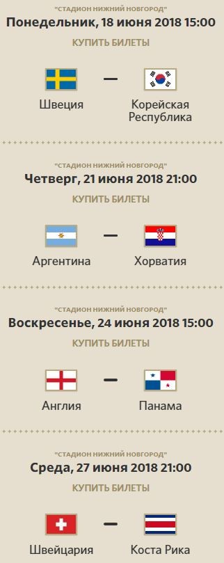 Нижний Новгород, новый стадион Вместимость 44 899 зрителей Строительство должно быть закончено к 2017 г. Новый стадион будет частью огромного сверхсовременного спортивного комплекса, включающего в себя яхт-клуб, сооружения для занятия гребным спортом и целый комплекс трамплинов. Футбольная арена будет находиться на полуострове Печерские Пески на берегу Гребного канала. На зрительских трибунах для увеличения вместимости предусматриваются модульные сборные конструкции, поэтому после проведения ЧМ-2018 вместимость стадиона уменьшится до 25000 зрителей. Рядом со стадионом идет строительство специальной транспортной развязки, а также рассматривает проект строительства дополнительных перебросных мостов. ----------