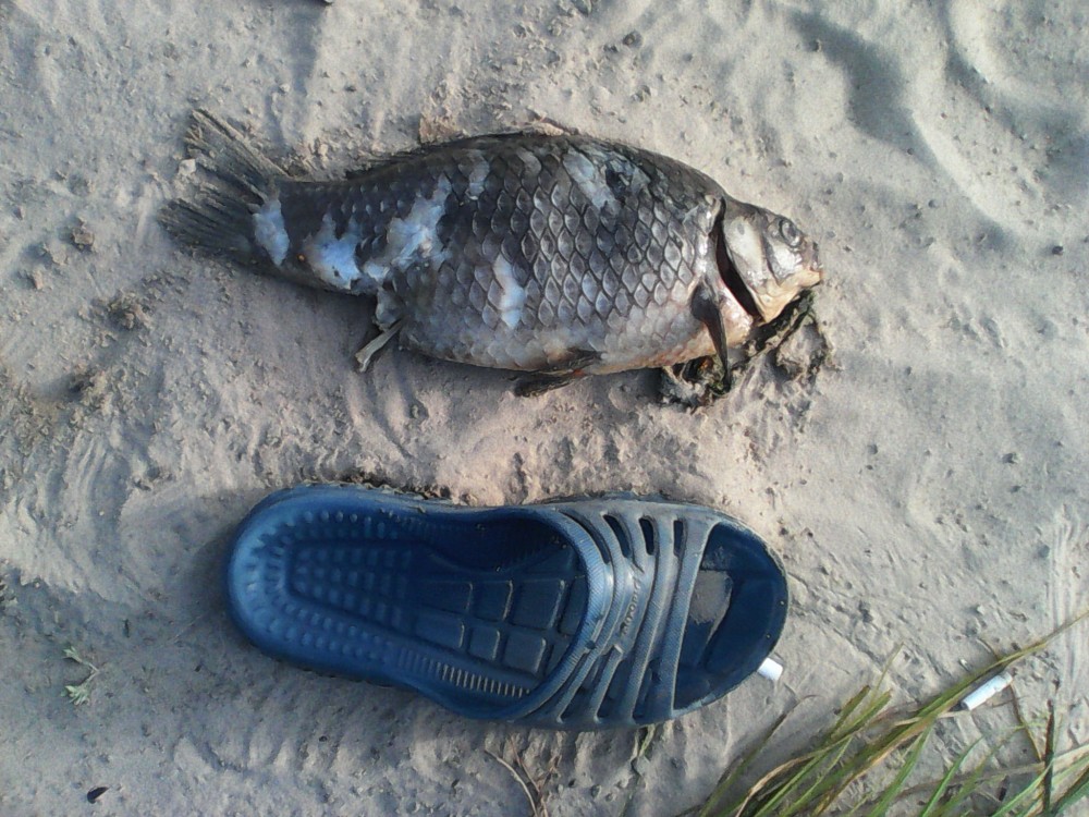 | Что то на реке в затоне не первый раз дохлятину к берегу прибило - это еще не самый крупный карась (тапок 42 размера), хотя клев совсем поутих..