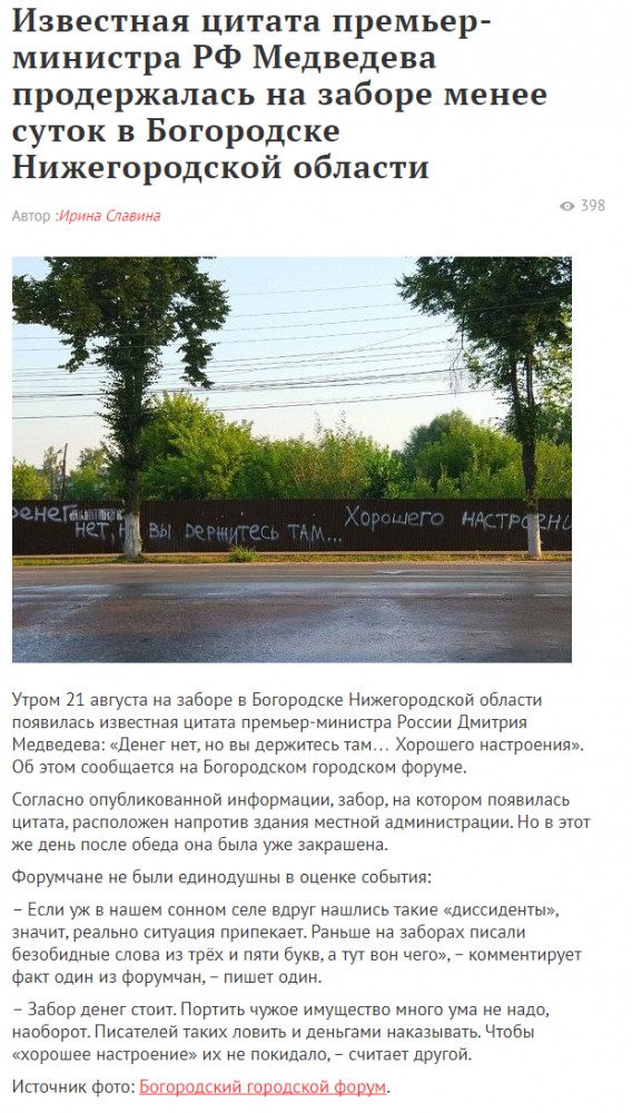 Звоночек. Если уж в нашем сонном селе вдруг нашлись такие "диссиденты", значит, реально ситуация припекает. Раньше на заборах писали безобидные слова из трёх и пяти букв, а тут вон чего...
