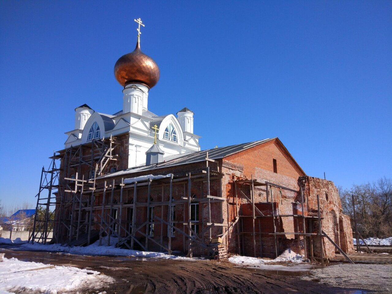 Восстановление Успенского храма в Богородске продолжается. На него подняли первый купол.